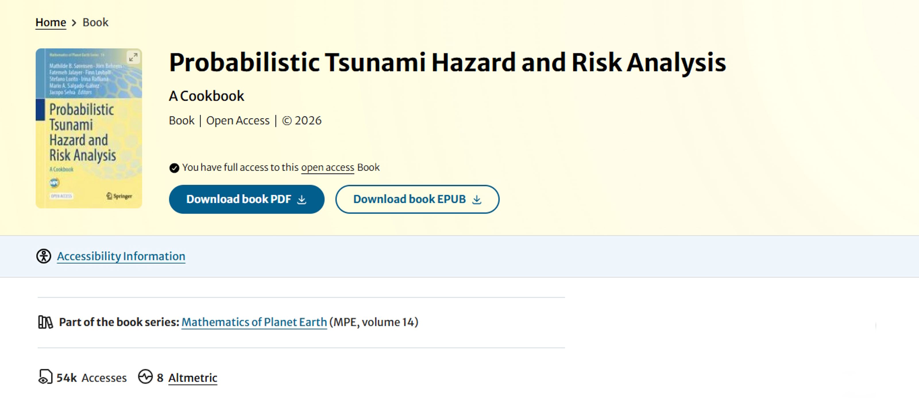 Screenshot from SpringerLink showing Probabilistic Tsunami Hazard and Risk Analysis: A Cookbook as open access, with more than 54,000 downloads within its first month after publication.