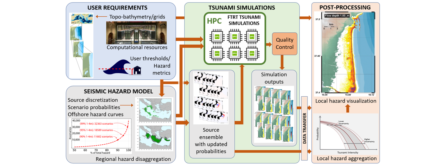 With advances in High Performance Computing (HPC), improved access to HPC resources, and the developments of Faster-Than-Real-Time tsunami simulation codes, it is now possible to simulate the inundation of tsunami waves onshore down to scales of the order of 5 or 10 meters. A workflow for this so-called Local PTHA is depicted in the image above. Tsunami inundation hazard maps can now be generated through the simulation of tens of thousands of scenarios at high spatial resolution, something that was not possible even 10-15 years ago. There is expertise within GTM of how to set-up, execute, and interpret local PTHA.